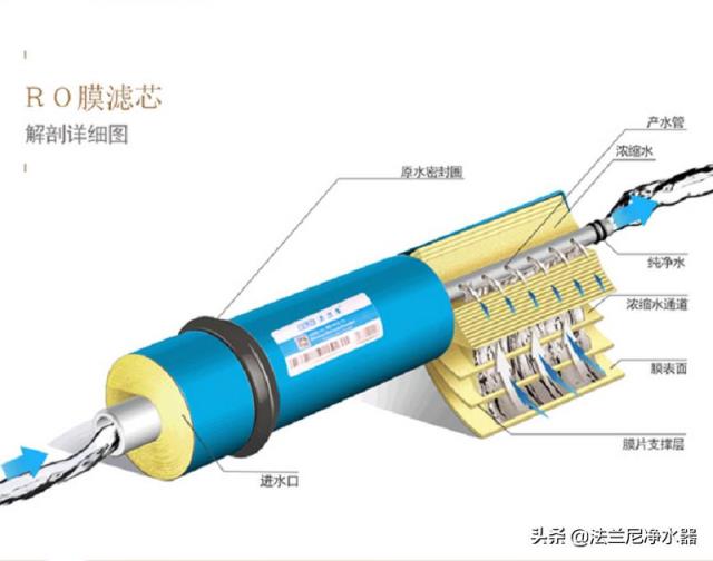 当渗透压增加到增压泵的压力时,水就不能通过反渗透膜流入净水一端。而水中的矿物质浓度增加,一些矿物质就会在反渗透膜表面沉积下来,长此以往就会将反渗透膜堵住。为此会有一部分的水对反渗透膜进行冲洗,而冲洗过后的水排出后就称之为“废水”。
