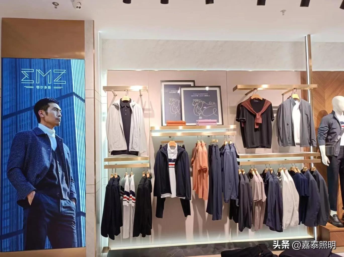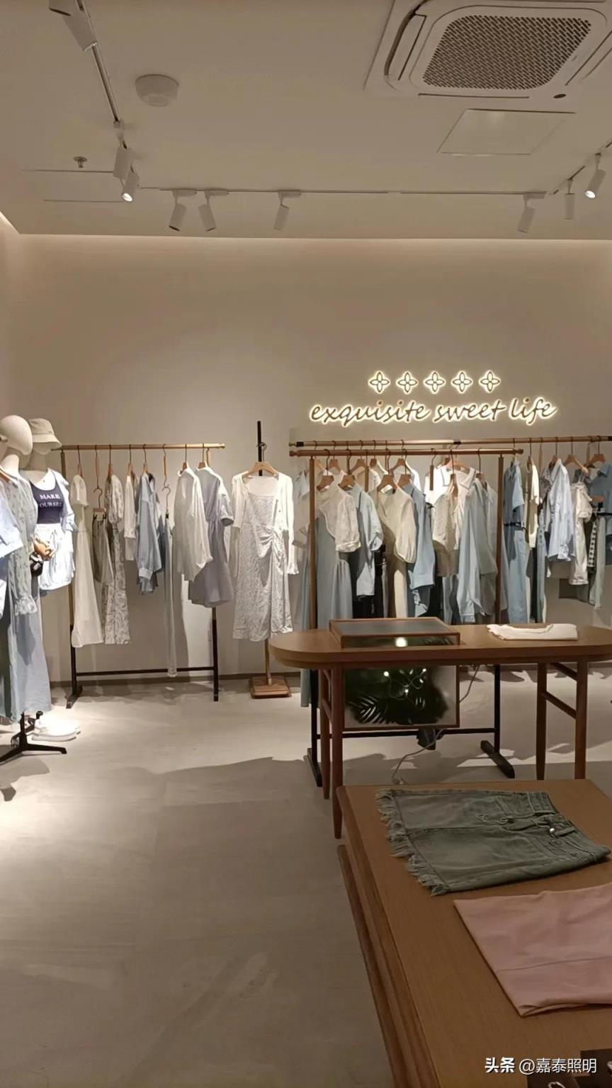 服装店有衣架展示的区域装轨道灯。其他区域可以用筒灯,进行基础照明。