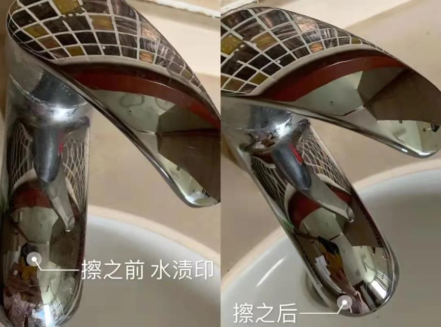 我用水龙头上面的水渍做了一个实验,清洁完之后,真的可以做到干净锃亮。