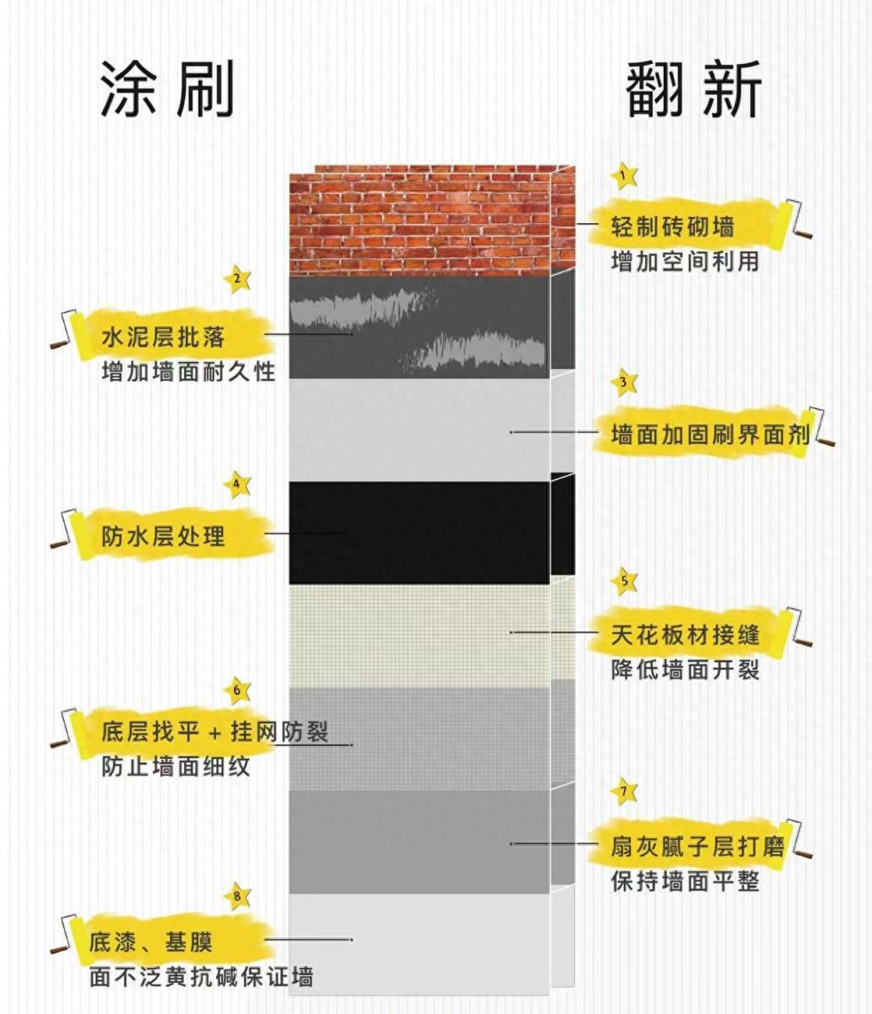 墙分为里层结构墙体(水泥浇筑墙体、轻体砖墙、红砖墙、轻钢龙骨石膏板墙)和外层装饰层(抹灰层、石膏层层、界面剂、腻子层、底漆面漆层)。如下所示:
