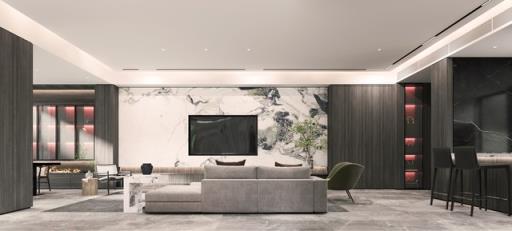 吊顶瓷砖是一种美观、耐用且容易清洁的选择。这种材料在打造现代和豪华风格的客厅上常常使用,可以选择不同的颜色和纹理来打造个性化的效果。