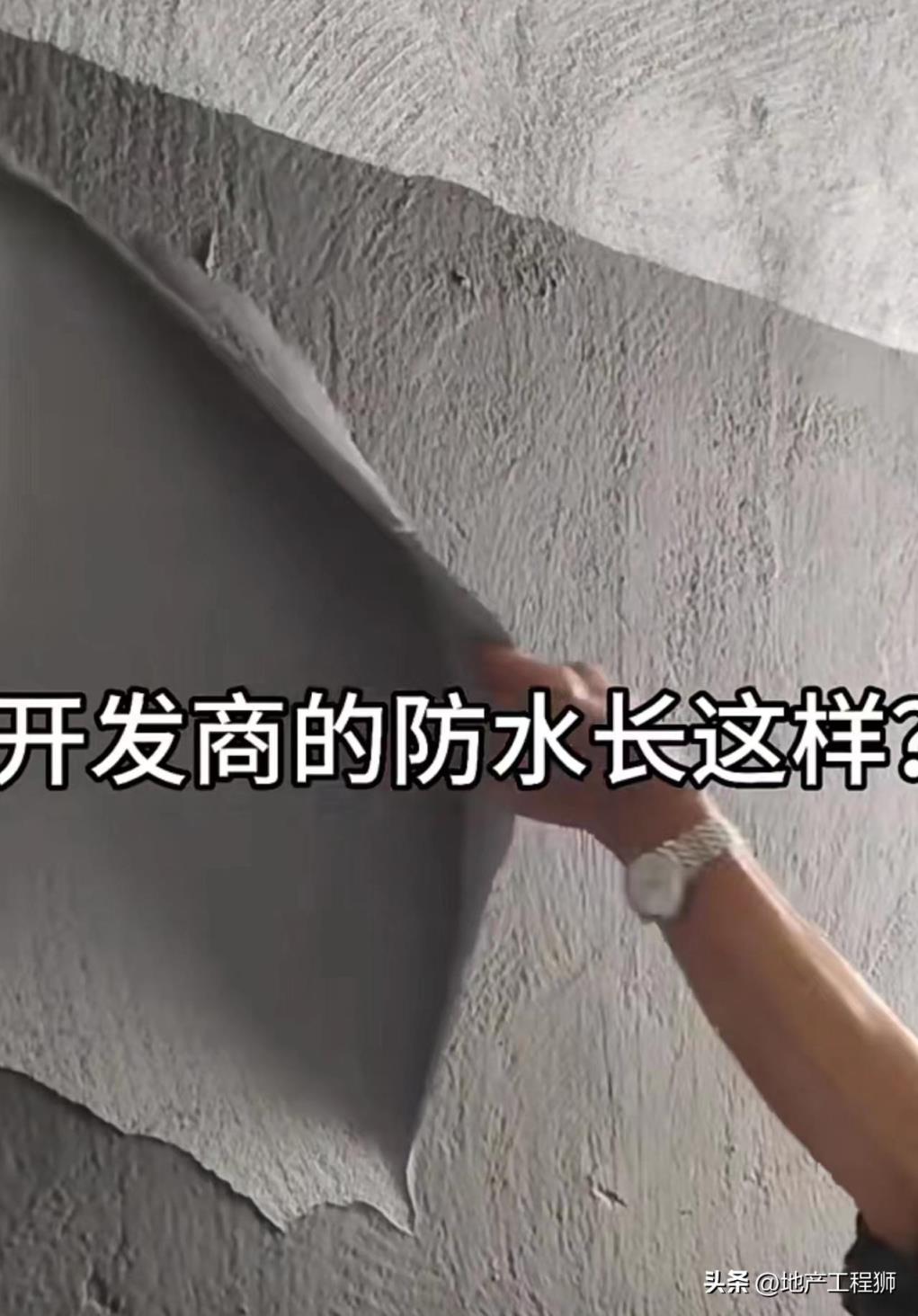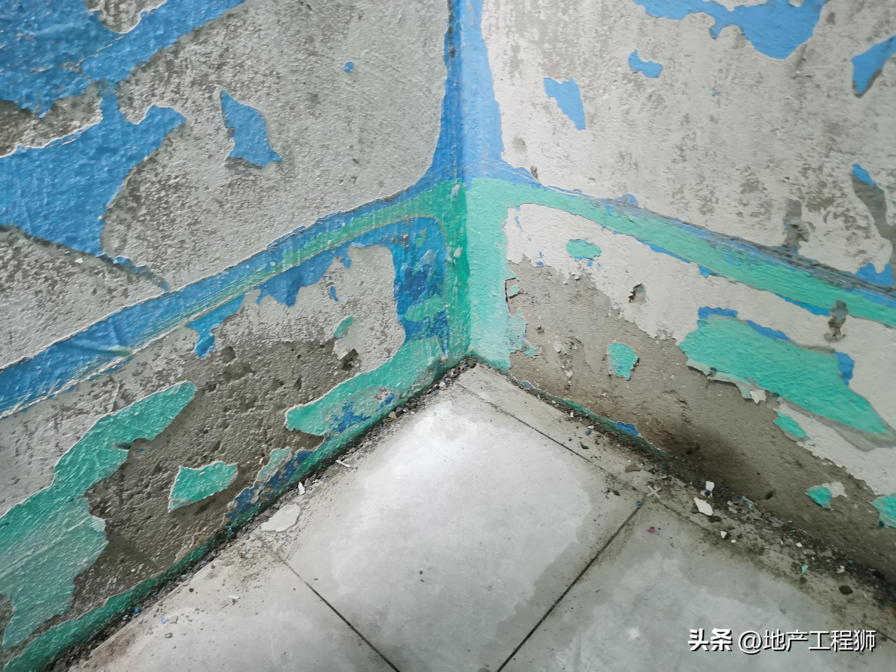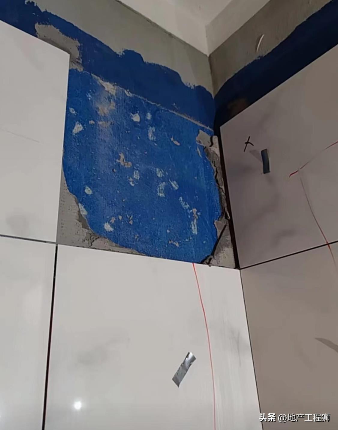 (2)第二种情况中又存在两种:一种是装修公司墙面实施为柔性防水(可以理解为墙面刷了一层胶),而柔性防水强度不高,粘接层直接将装修公司实施的柔性防水层扯掉,从而空鼓;另一种是装修公司实施防水时未将原开发商JS柔性防水铲掉而直接涂刷墙面刚性防水,后续粘接层硬化收缩将原开发商JS柔性防水扯掉,导致空鼓。这两种情况都比较隐蔽,不易被发现。