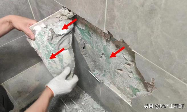 瓷砖直接脱落或敲开发现砖与粘接层(水泥砂浆或专用瓷砖粘接剂/胶)脱落空鼓,转接层未满刮。