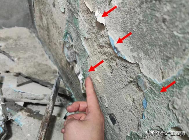原开发商抹灰层空鼓,导致墙面敲击存在空鼓声。或抹灰层强度不足,起砂。