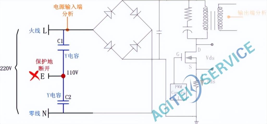 当电源插头的保护地断开时,220V电压被Y电容分压,中间的110V电压直接加在示波器的金属外壳上。 会危及人身安全,但也是危险的操作。
