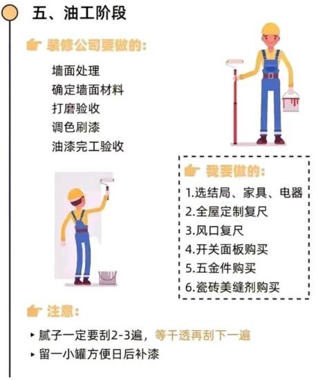 油漆工程是装修的最后一道“美容工序”,墙面基层处理要做好,刮腻子要平整光滑,一般要刮2 - 3遍。刷乳胶漆时,要注意施工环境,阴干施工,避免开窗暴晒导致墙面开裂。如果选择贴墙布,要先刷基膜,然后再贴墙布,确保墙布粘贴牢固。乳胶漆刷完后,要预留一些备用漆,方便后期修补。