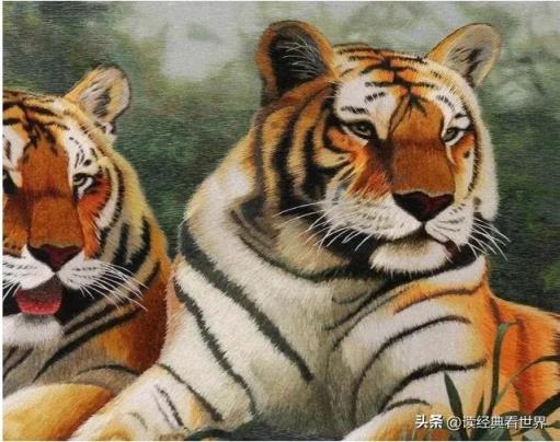 苏绣着色绣品若画、富有层次;湘绣以狮、虎为代表作,故有"苏猫湘虎"的说法。