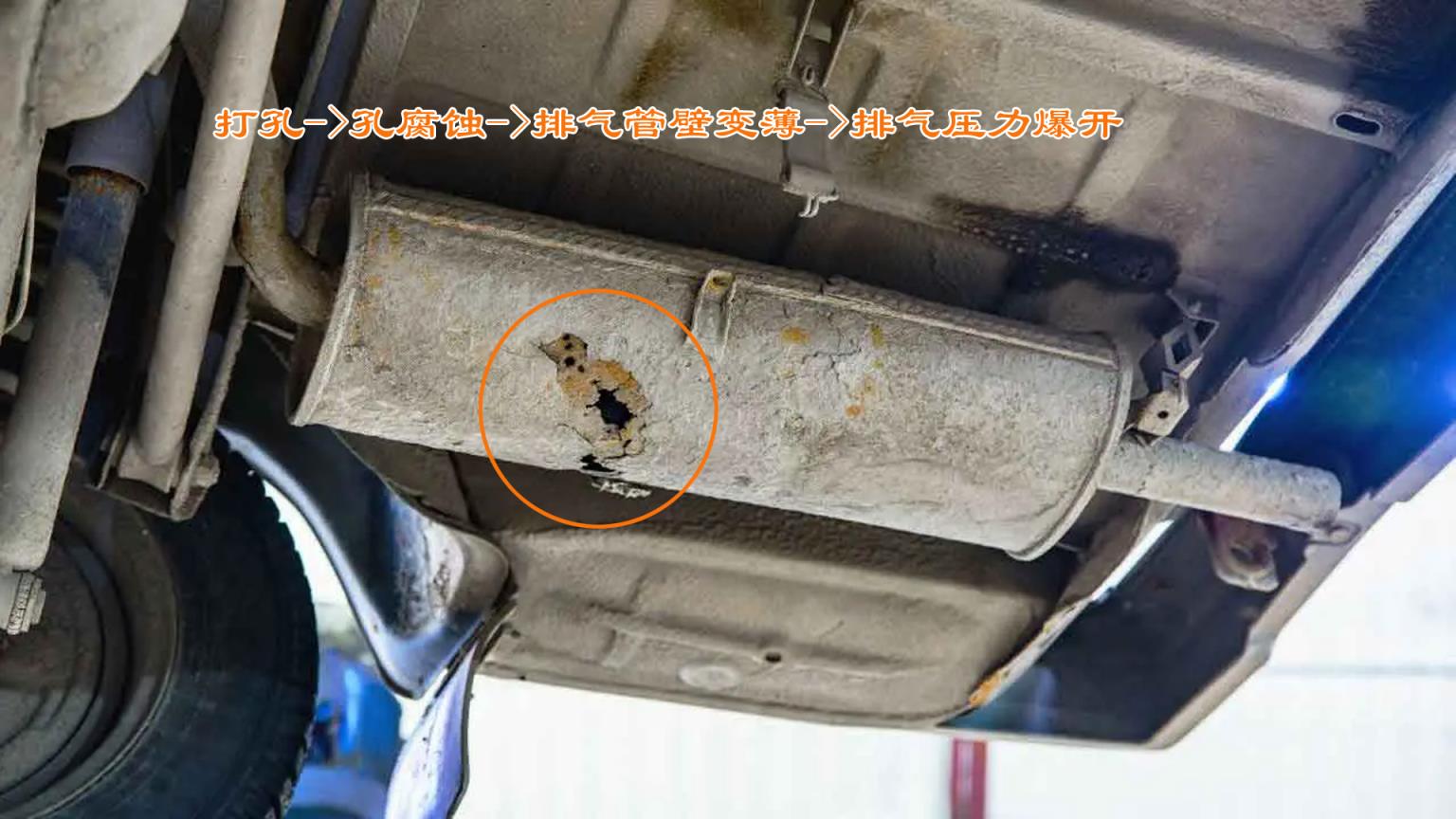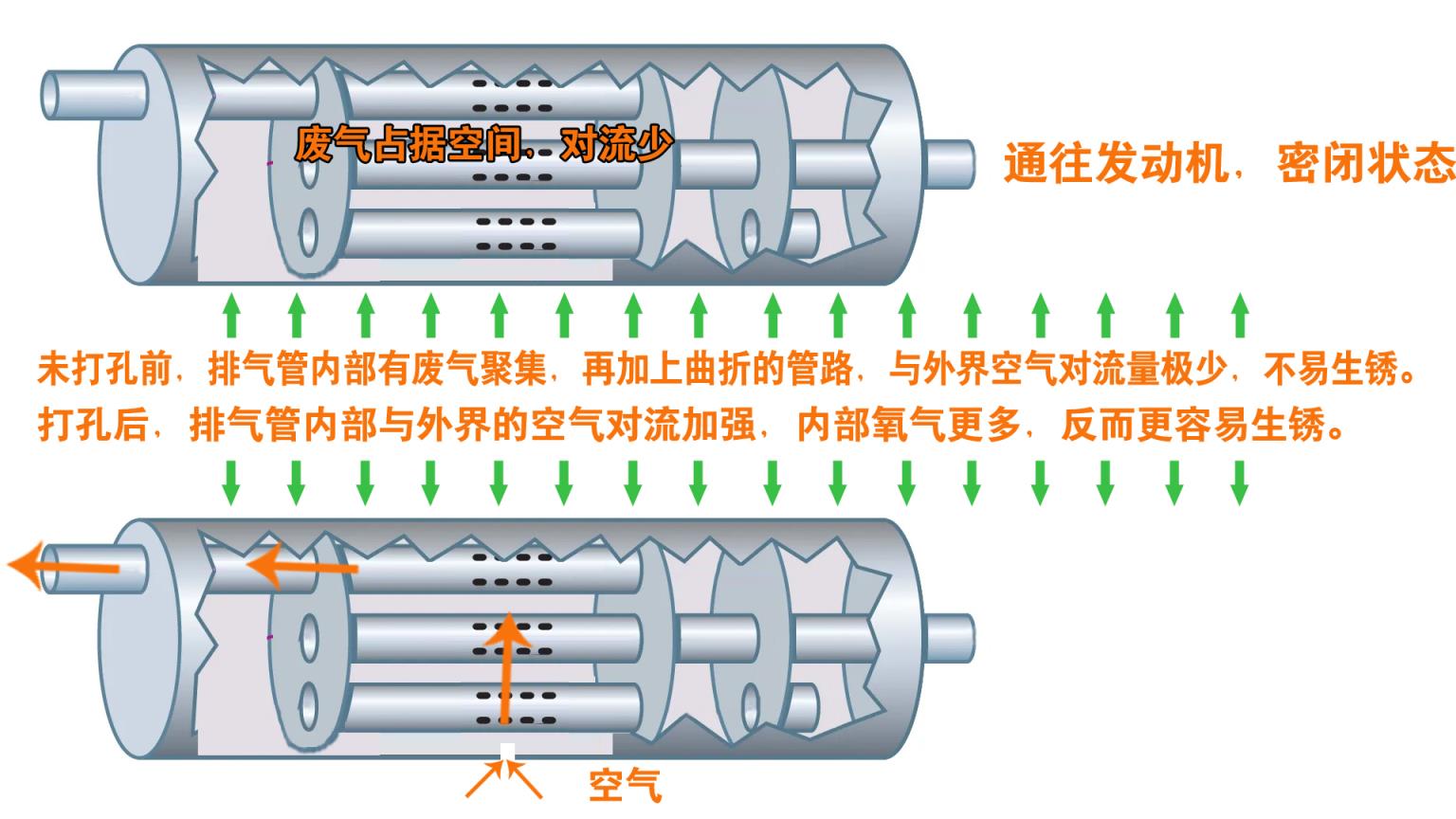 而打孔后排气管尾口和孔洞之间就很容易形成空气对流,这会使大量新鲜空气充斥在排气管内部,最终导致其加速氧化生锈。