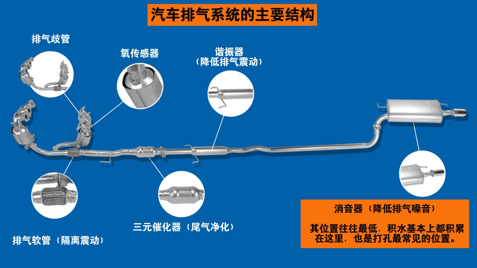 发动机充分燃烧后会产生很多水蒸气,这些水蒸气在排气系统里遇冷会变成液态水并积累起来。有人担心时间长了这些水会加速排气系统生锈,所以就想出了给排气管上打孔排水的方法,想避免排气管锈蚀。
