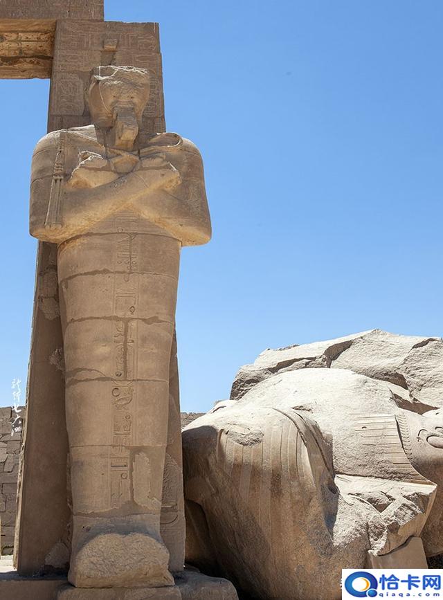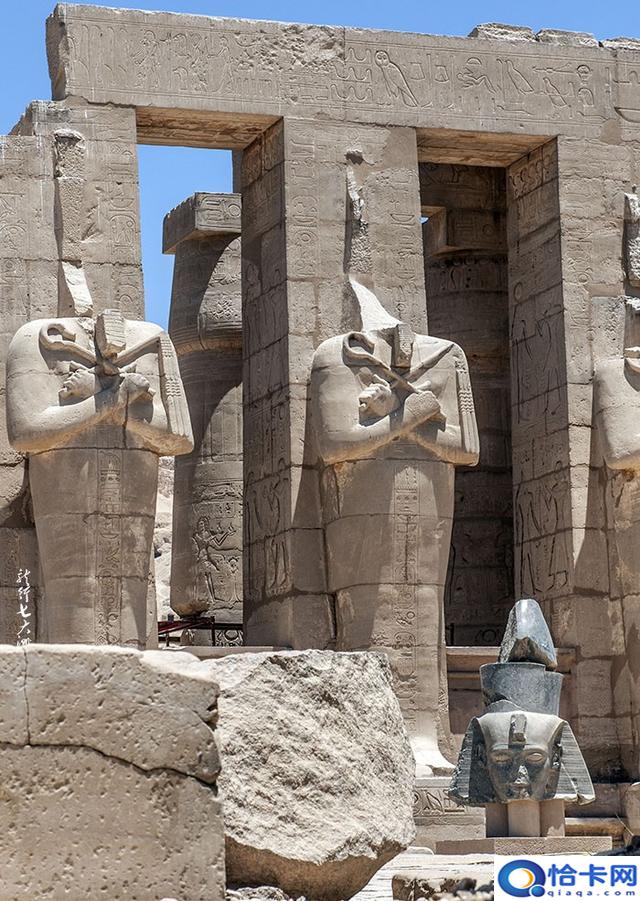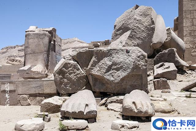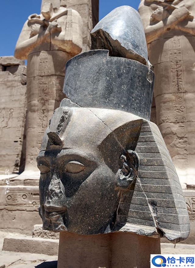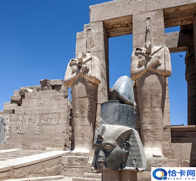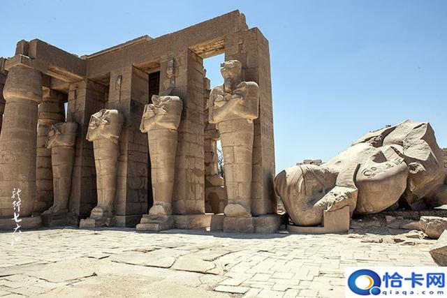 在第一靠近西边楼梯的拉美西斯二世巨像还剩下一部分,这就是雪莱诗中的奥西曼提斯,它曾经高达17.5米,如今却凄凉地躺在地上。一对用花岗岩打造的拉美西斯二世雕像,现仅剩的一尊,但头部已断了,落在第二庭院的地上。