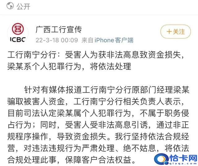 工商银行南宁分行3月18日凌晨回应称,目前司法认定梁某属个人犯罪行为,不属于职务侵占行为;同时,受害人受非法高息引诱,通过非正规程序操作,导致资金损失。我行坚持依法合规经营,对违法违规行为严肃处理、绝不姑息,将依法合规处理此事,保障客户合法权益。