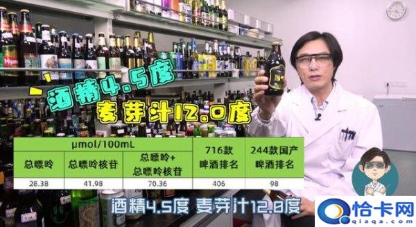 福建的惠泉啤酒,上一期视频的评论中有粉丝也提到了,它酒精4.0度,麦芽汁10.0度,每100mL含有总嘌呤24.81μmol、总嘌呤核苷26.18μmol,两者之和是50.99μmol,在716款啤酒中排名568,在244款国产啤酒中排名第150。