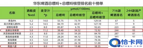 接下来看江西的南昌八度,酒精2.5度,麦芽汁8度,每100mL含有总嘌呤18.87μmol、总嘌呤核苷19.48μmol,两者之和是38.35μmol,在716款啤酒中排名652,在244款国产啤酒中排名第201。这款啤酒麦芽汁的含量恰好为八度,就被命名为南昌八度。