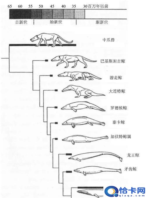 鲸的祖先是生活在陆地上的原始哺乳动物中爪兽类,第一种具有鲸类特征的是本世纪初出土于巴基斯坦的巴基兽,又称巴基鲸,生活在距今约5500万年前,体型只有狗那么大。巴基鲸生活在近水区域,属于半水生动物,它是鲸“下海”的探索者,也是哺乳动物重返海洋的先驱。