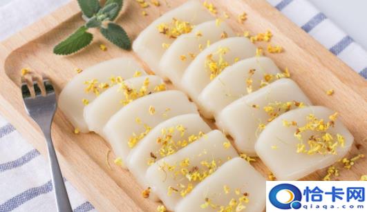 3、年糕,因为谐音“年高”,再加上有着变化多端的口味,几乎成了家家必备的应景食品。年糕的式样有方块状的黄、白年糕,象征着黄金、白银,寄寓新年发财的意思。