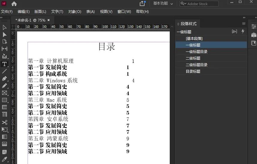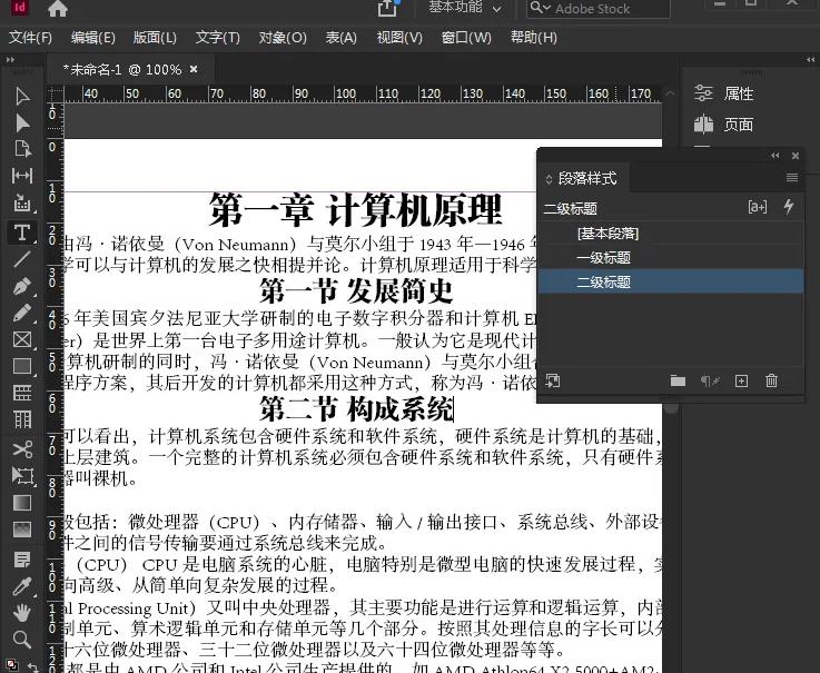 1、在InDesign中新建文档并导入文本,做目录之前最主要的就是在文档标题上应用段落样式,例如,文章一级标题、二级标题,甚至是三级标题,如图所示。