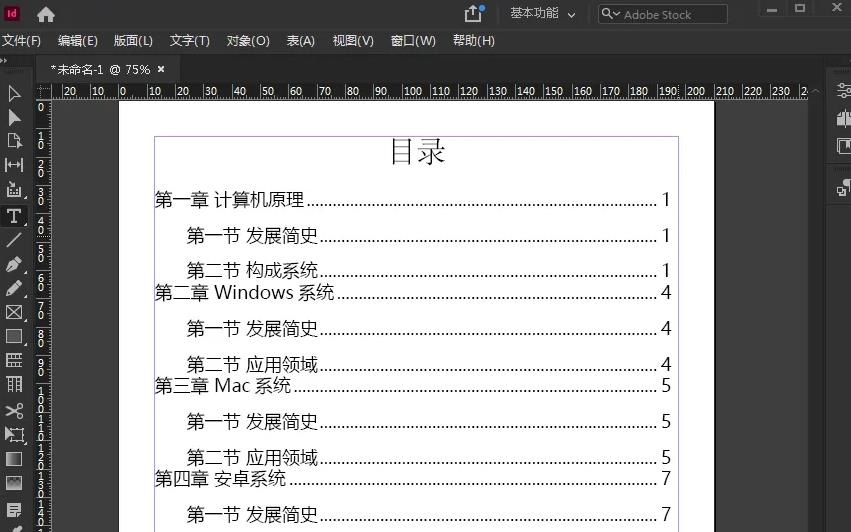 3、单击【确定】按钮后,鼠标光标变成置入文本标志,在目录内容放置页面上按Shift键自动排文即可生成目录内容,但是,目录内容尚未格式化,如图所示。