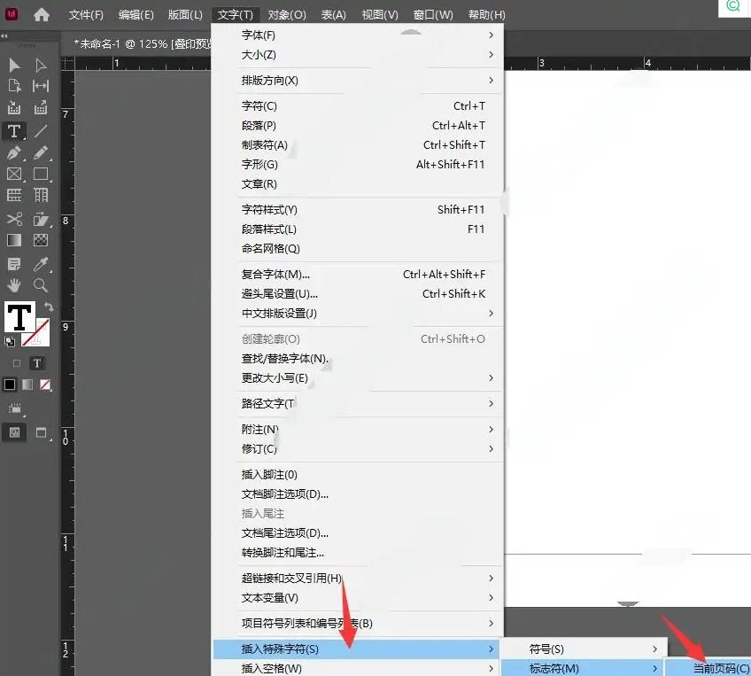 3、然后打开文字菜单,选择下方栏中的插入当前页码