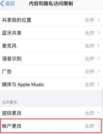 打开“设置”-“屏幕使用时间”-“内容和隐私访问限制”,下拉到“允许更改”栏目。将账户更改设置为“允许”。
