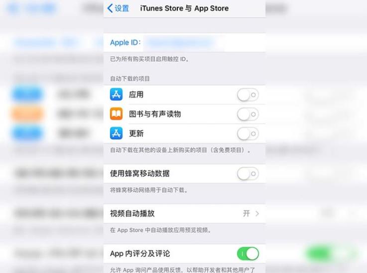 3、点击“iTunes Store与App Store”功能项进入到iTunes Store与App Store界面,可以看到Apple ID。如图