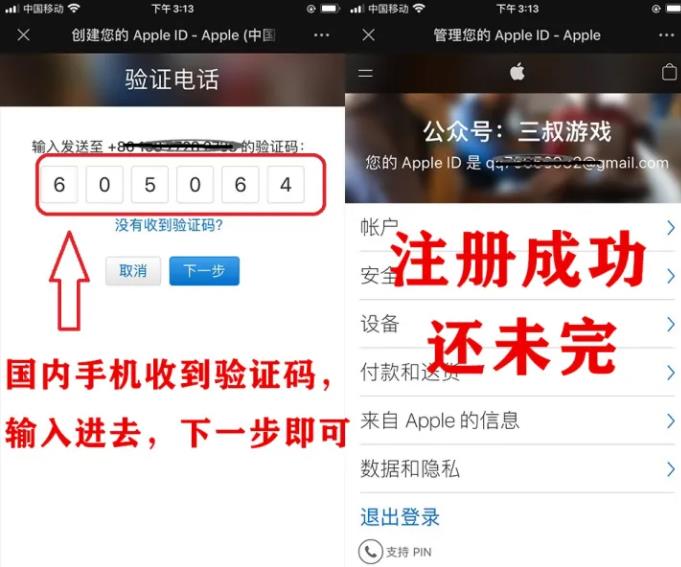 第三步:验证完邮箱之后,接着系统会发送验证码到你手机,按照要求填写即可。这时,一个台湾的Apple ID就已经注册成功,但是还不能使用,还需接下来的操作。