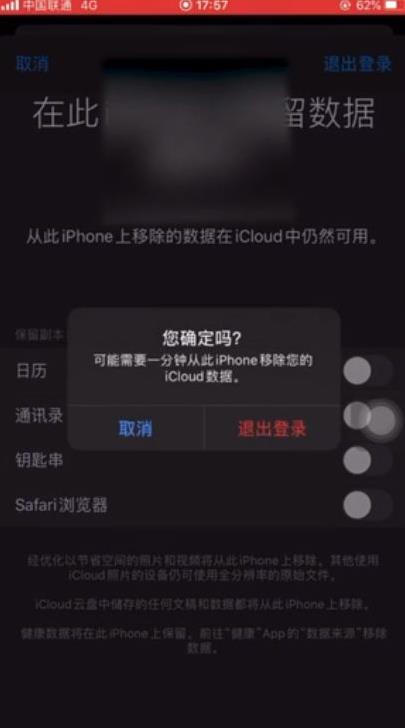 2、输入密码之后,点击“确定移除iCloud数据”,等待退出完成。