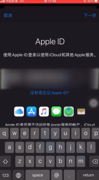 4、进入之后输入新的Apple ID账号,点击“下一步”,然后根据提示操作即可。