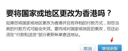 4、选择香港地区后,它会弹出“要将国家或地区更改为香港吗?”选择下方的“继续更新”