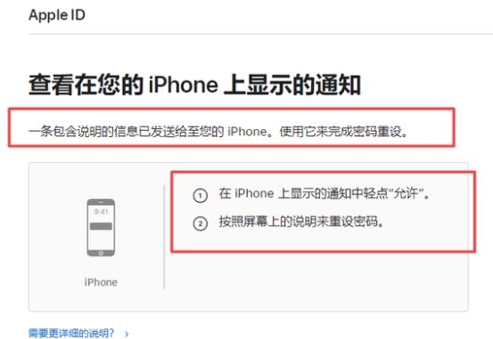 5、随后会看到提示,会在对应iphone上显示通知,按提示完成密码重设。
