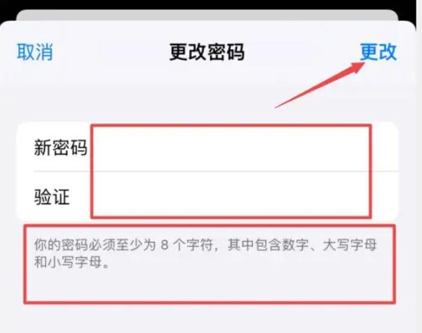 5、根据密码要求,在新密码和验证中,都输入同一个要设置的apple id密码后,点击“更改”即可。