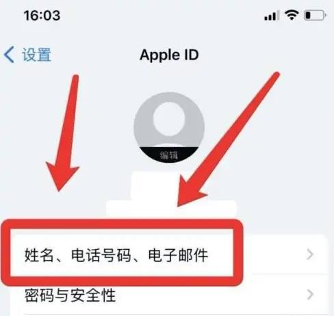 首先打开手机设置,进入Apple ID页,打开“姓名、电话号码、电子邮件”页面。