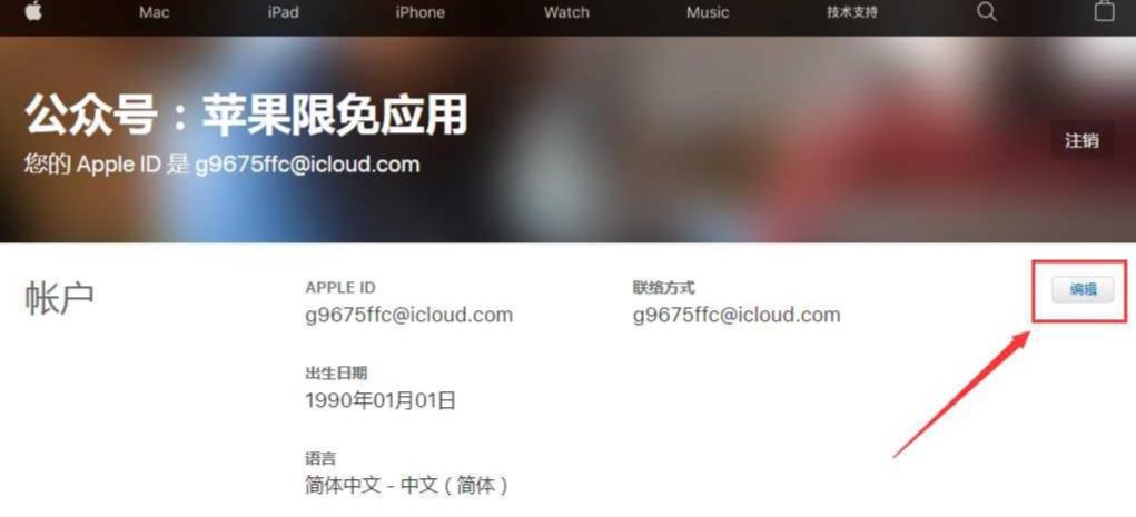 2、把注册好了的国内Apple ID从http://appleid.apple.com登录,登录后进入到苹果账号的管理中心,点击“编辑”账户。