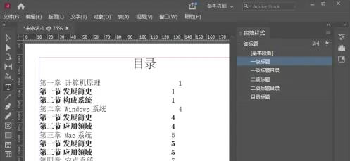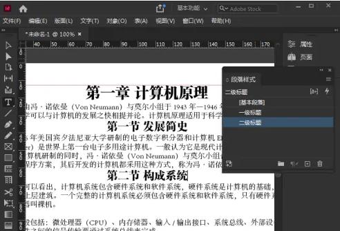 1、在InDesign中新建文档并导入文本,做目录之前最主要的就是在文档标题上应用段落样式,例如,文章一级标题、二级标题,甚至是三级标题,如图所示。