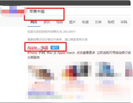 1、打开百度搜索栏,输入【苹果中国】,打开苹果官网界面