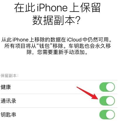 退出时将保留副本选项后方的开关开启即可,如健康、通讯录、钥匙串、Safari等都开启。