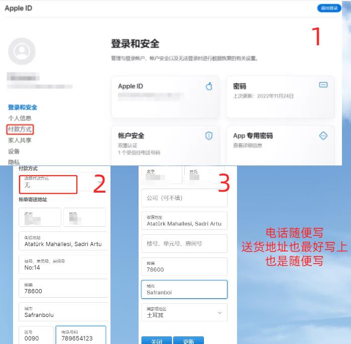 2、进入https://appleid.apple.com/account/manage修改地区,付款方式选“无”,百度搜一个土耳其地址,比如这个https://zhidao.baidu.com/question/328653093591517485.html?qbl=relate_question_0,电话随便写,送货地址也最好写上,也是随便写,跟上面完全一样也没关系,最后点“更新”,之后付款方式那儿不会直接显示地址,不用管。