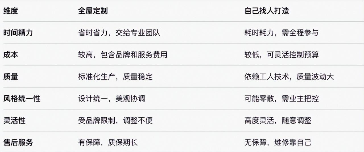 选择全屋定制还是自己找人打造,需综合考虑以下因素: