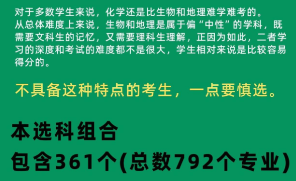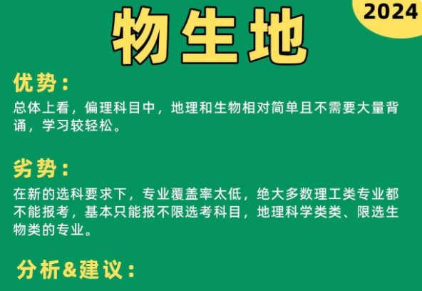 物生地组合中,物理很明显偏向于理科,生物属兼具理科和文科的部分,地理的学习除了背诵和记忆,需要有一定的逻辑思维能力,可以说学科之间关联度还是很强的,整体可以将这个组合定性为强思维的偏理科组合。推荐男生选择的专业有:计算机科学、计算机科学与技术、电子信息工程专业、地质学、环境科学、 生物科学、海洋科学、临床医学、口腔医学、测绘工程、地质工程、农业水利工程、海洋渔业科学与技术、生物医学工程等。