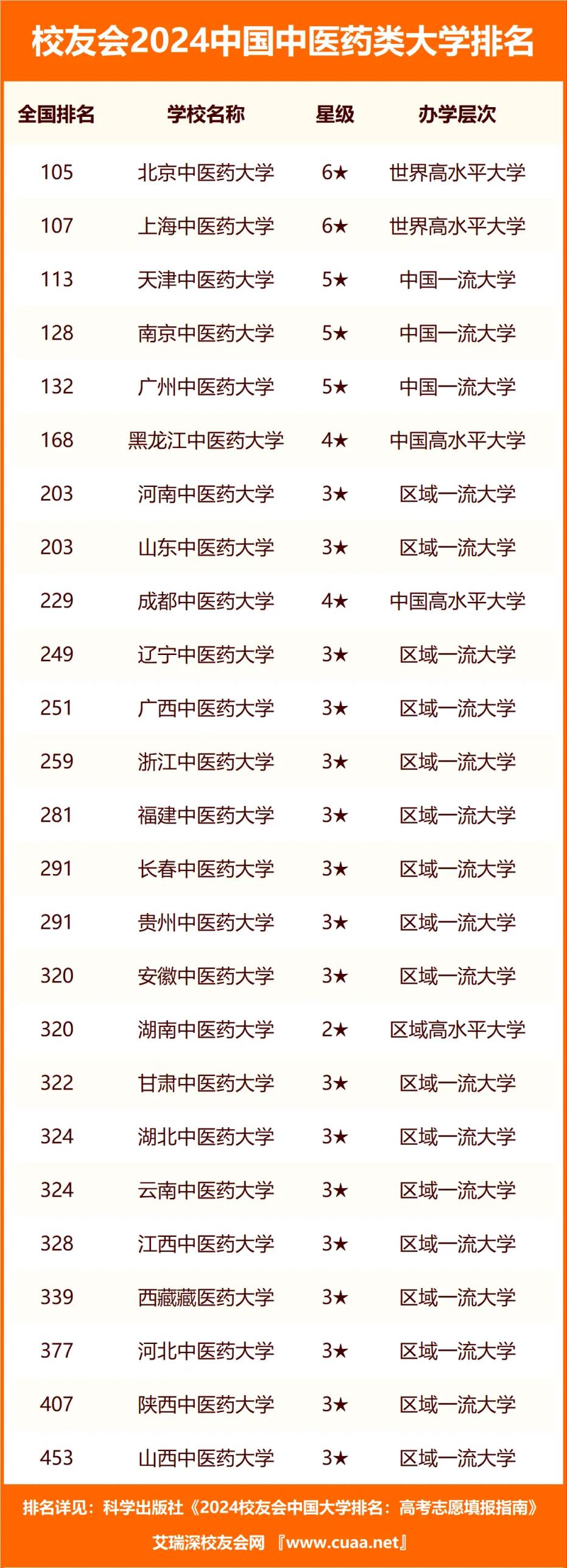 根据校友会2024年发布的排名,全国范围内的中医药类高校从多维度被评定为不同的等级和办学层次。排名靠前的几所高校均具备较高的教学水平和较强的科研实力,以下是排名前十的中医药大学及其办学层次: