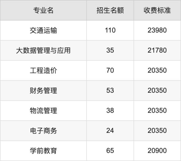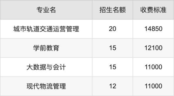 西安交通工程学院在文科高职专科批招生的各个专业,每年的学费是11000元-14850元。招生人数最多的专业是城市轨道交通运营管理,2024年招20人,学费是14850元。