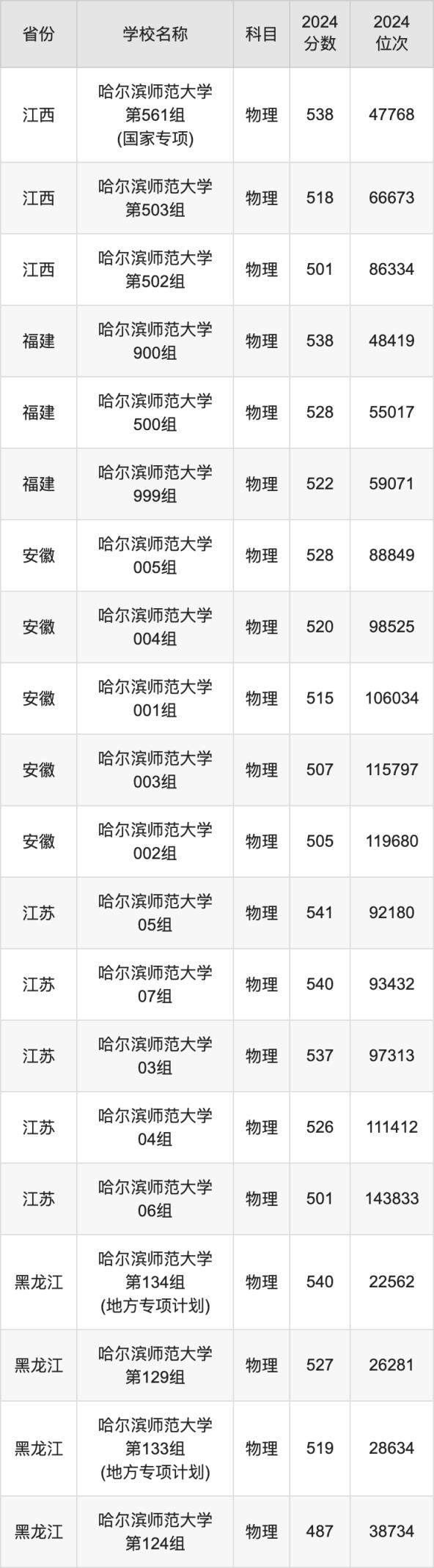 哈尔滨师范大学2024年有71个专业组面向黑龙江省内首选了物理科目的考生招生,第134组(地方专项)的收分最高,分数线达540分,选科要求是化学,招生专业包含数学与应用数学、物理学、化学、生物科学。第127组的录取分数线最低,2024年为438分,选科要求是不限,招生专业包含广播电视编导。