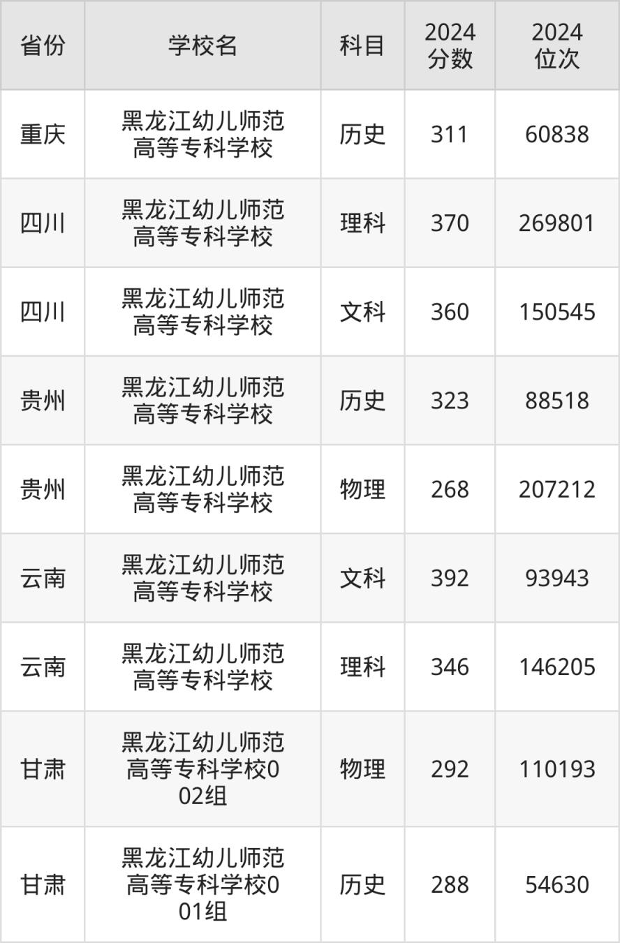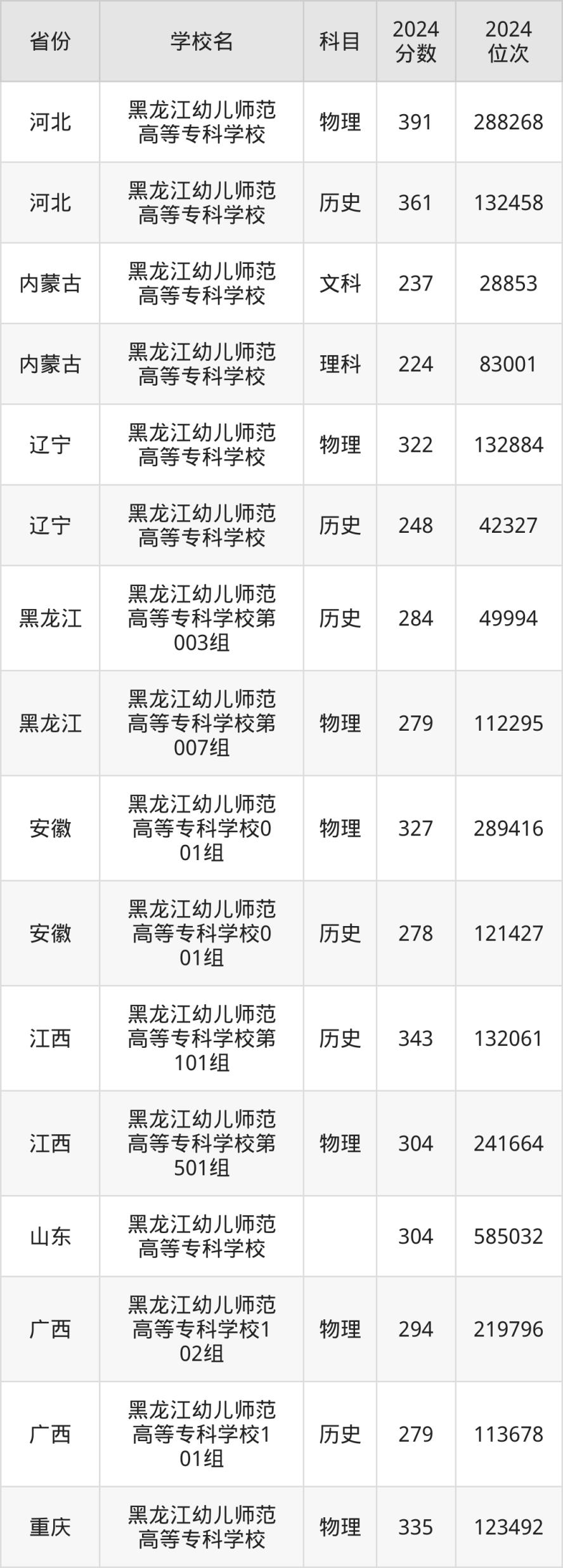由于全国数据较多,因此本文仅展示黑龙江幼儿师范高等专科学校省内近一年录取分数线汇总。