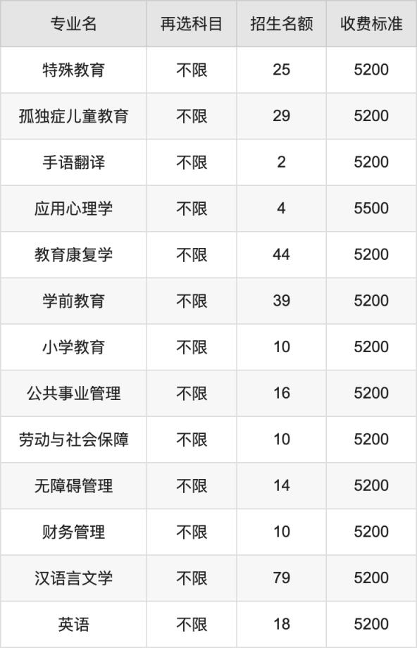 南京特殊教育师范学院在历史组本科批招生的各个专业,每年的学费是5200元-5500元。招生人数最多的专业是汉语言文学,2024年招79人,学费是5200元。