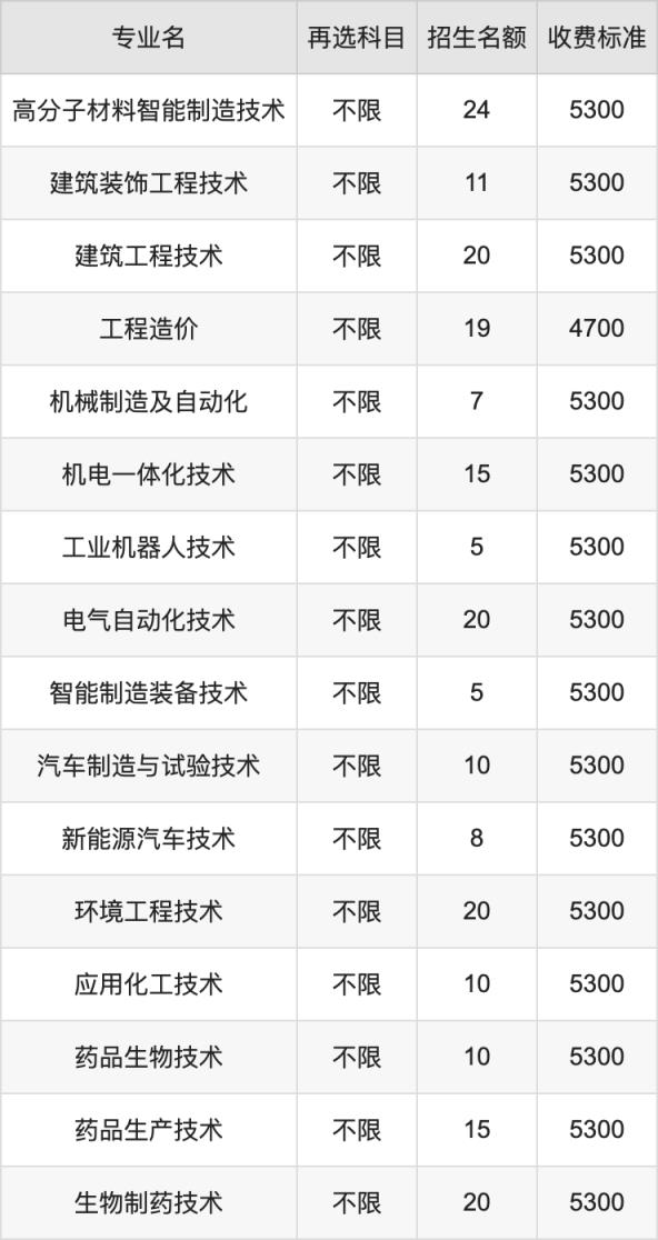 徐州工业职业技术学院在历史组专科批招生的各个专业,每年的学费是4700元-5300元。招生人数最多的专业是大数据与会计,2024年招26人,学费是4700元。