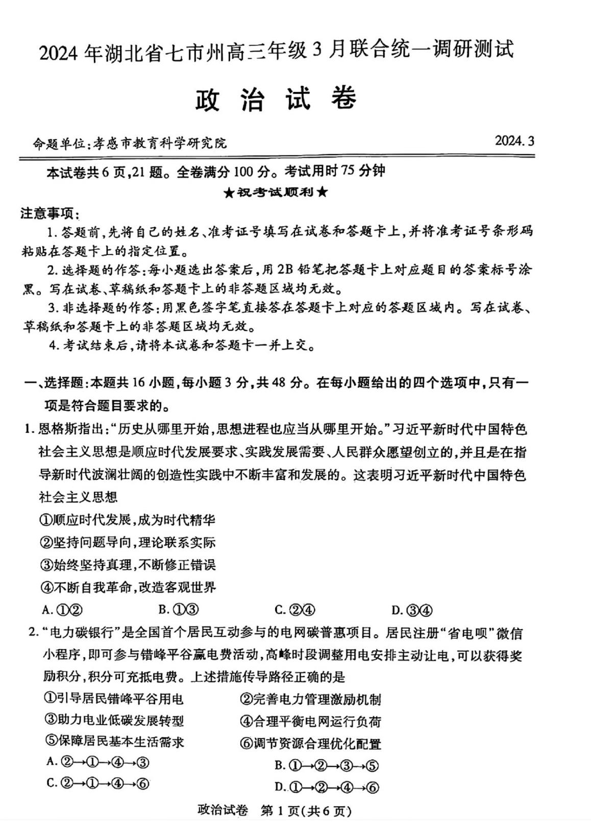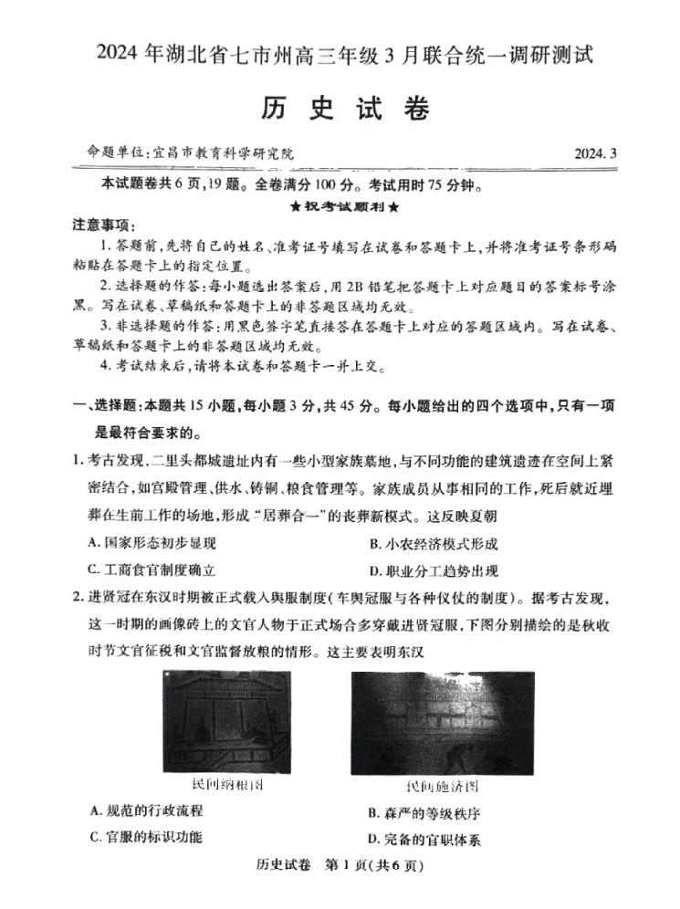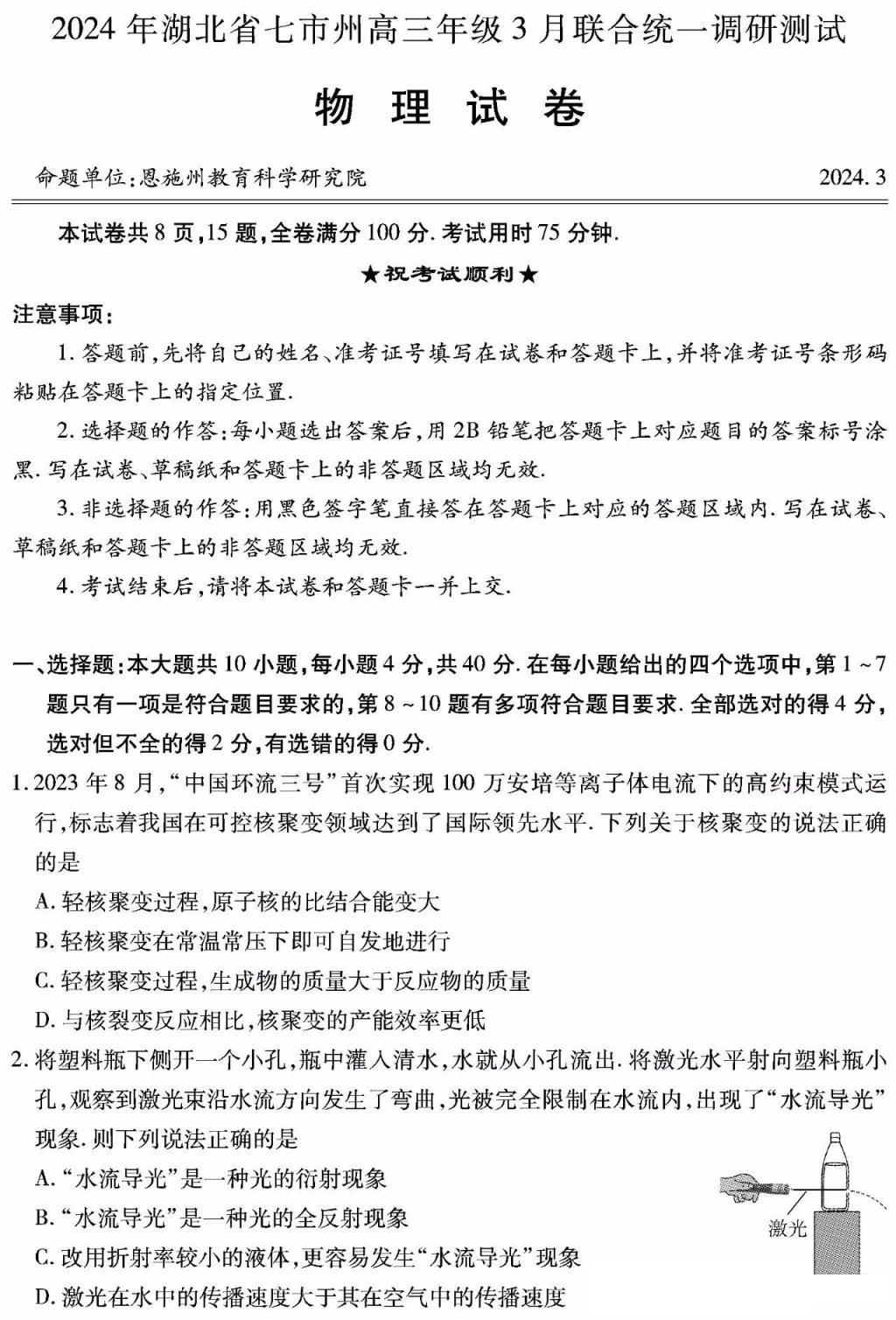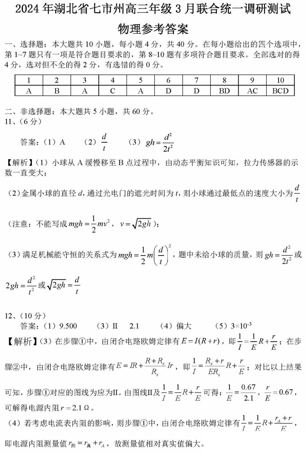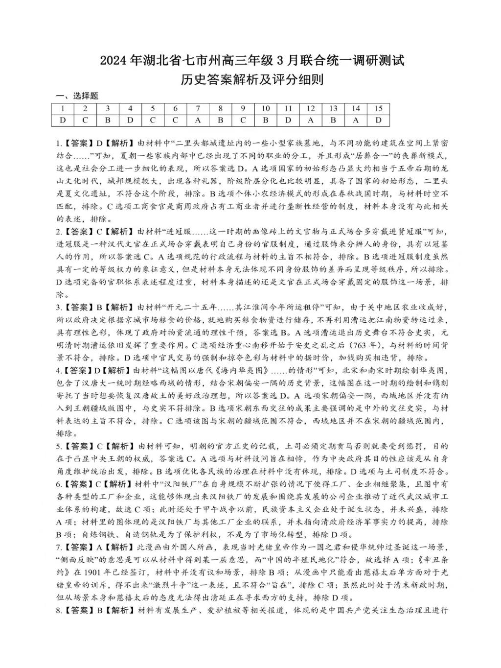 五、湖北省七市州联考2024物理/历史试题及答案解析