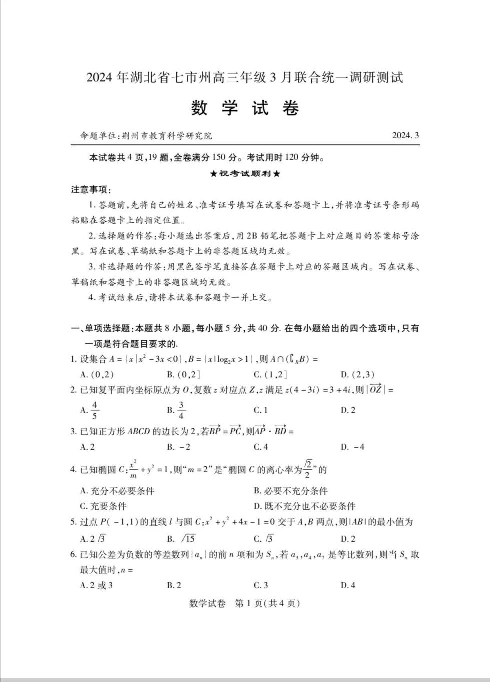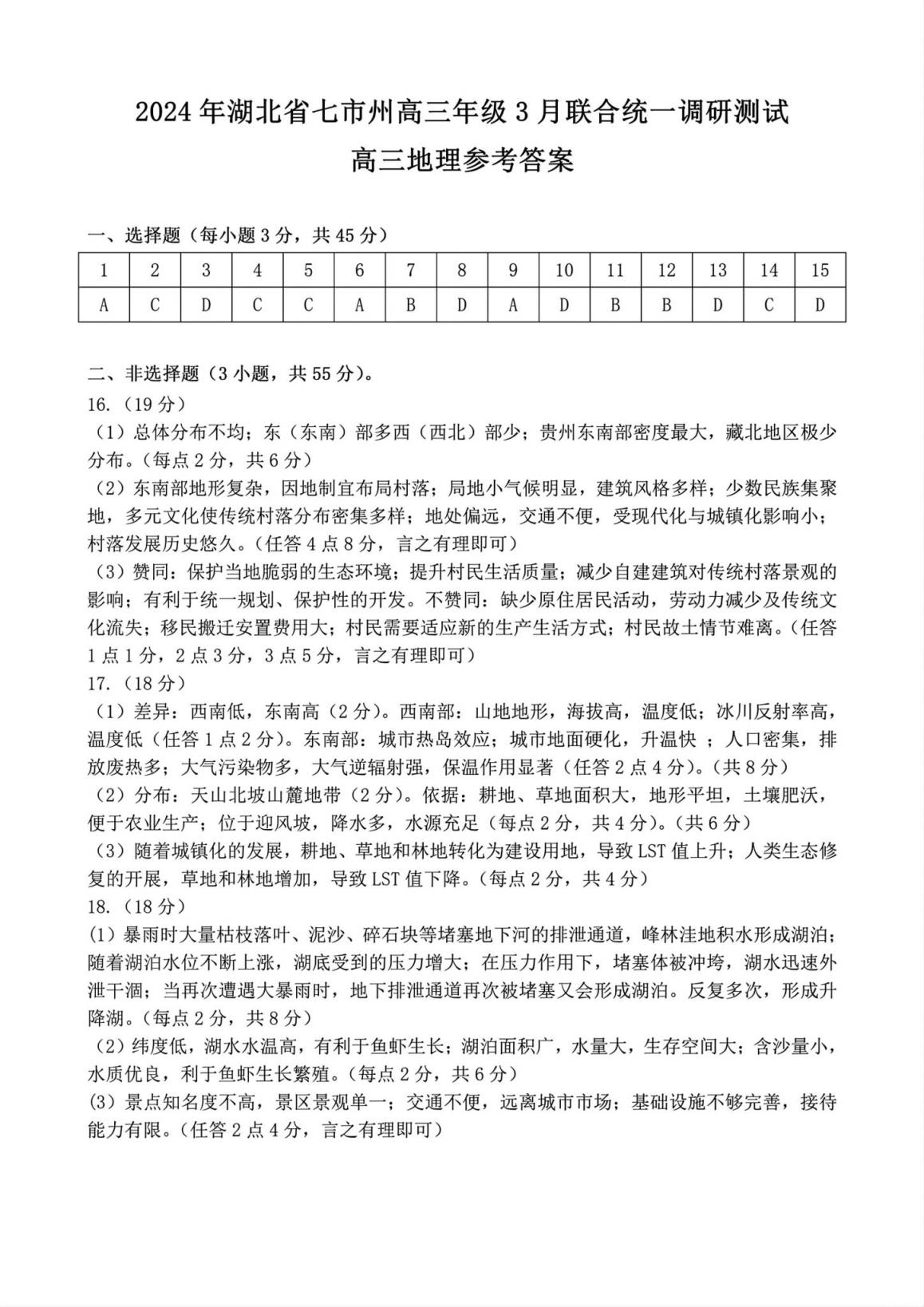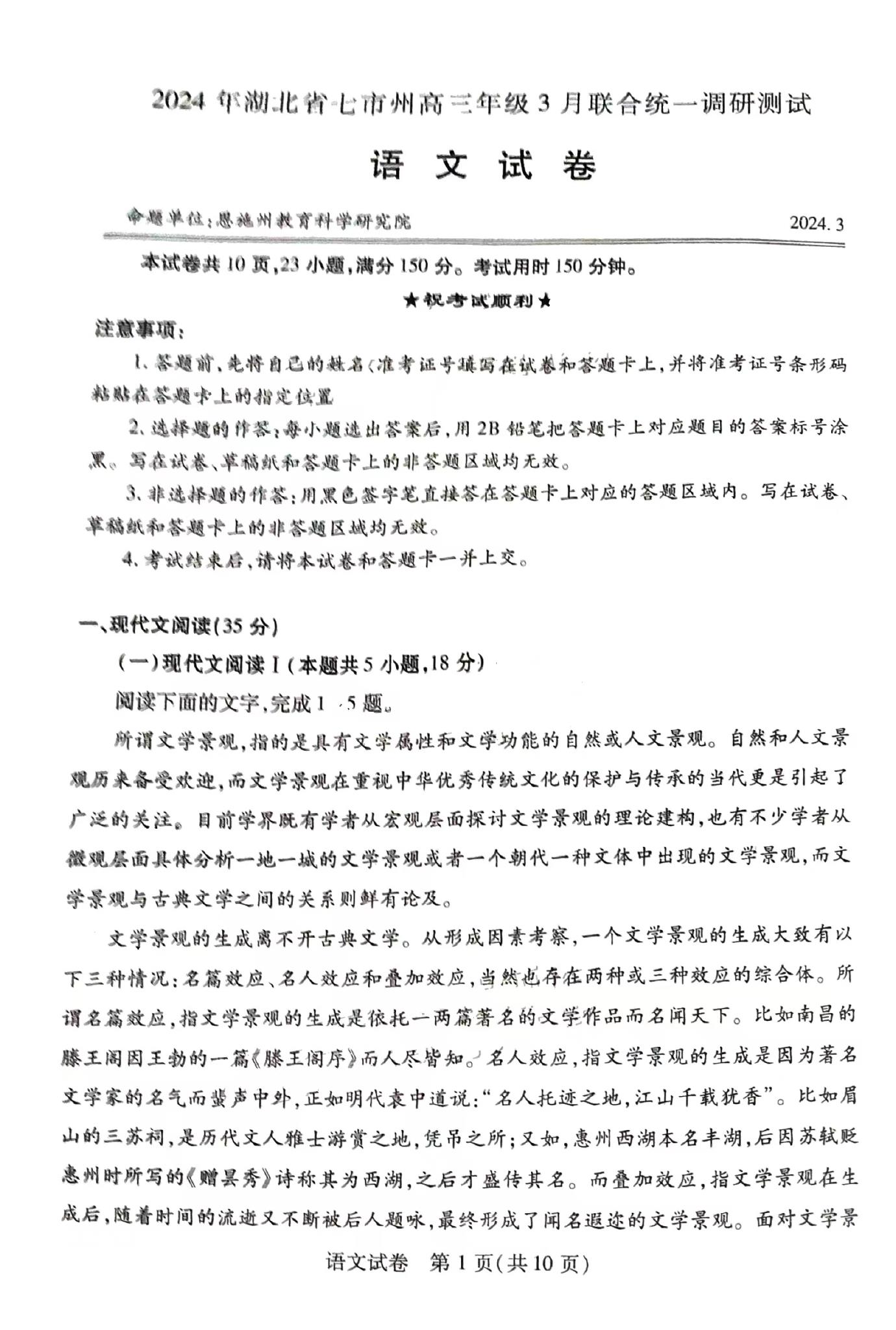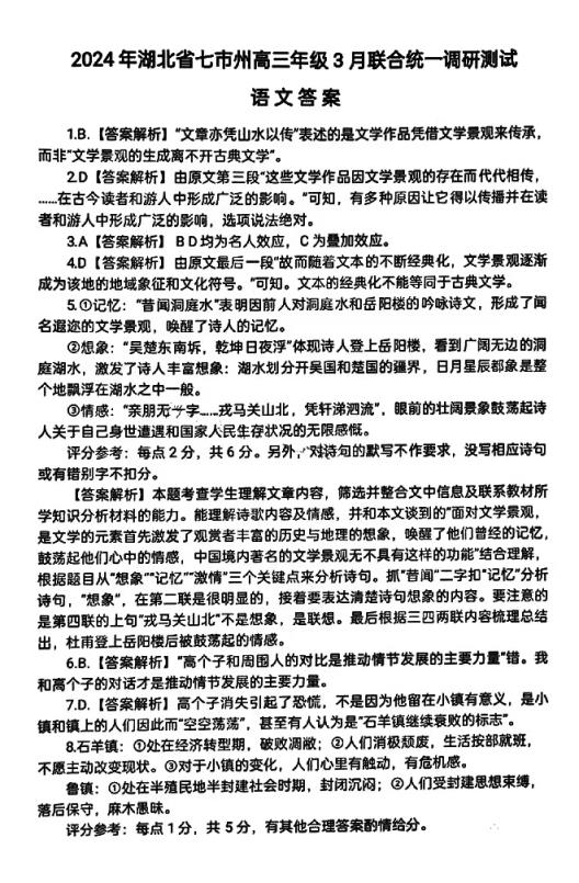 湖北省七市州联考将于3月12日至3月13日举行,包含了九门考试科目,分别是语文、数学、英语、物理、历史、政治、地理、生物、化学。为帮助湖北荆州、荆门、宜昌、恩施等七市州的高三考生核对答案,小灯塔在下文展示了湖北七市州联考试题及答案,供参考。