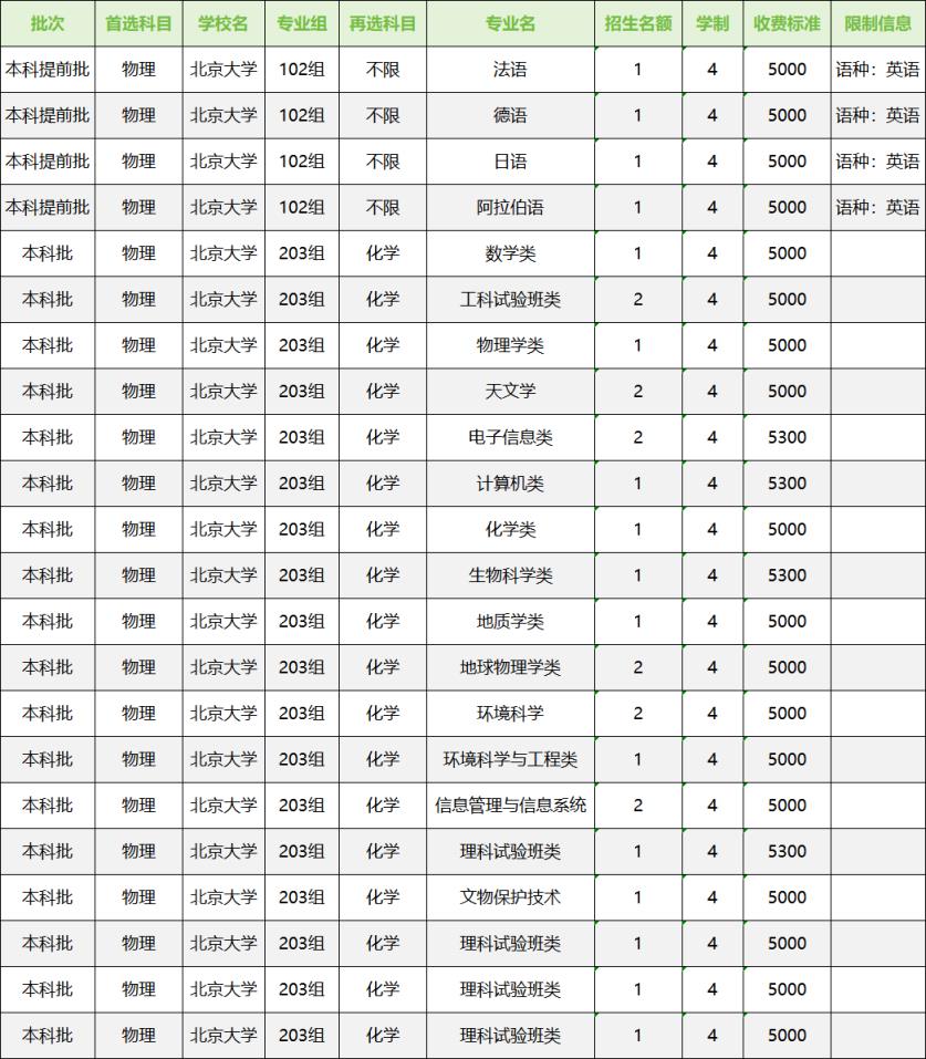 本科批招生专业有物理学类、天文学类、化学类、计算机类、地质学类等,选科要求为物理+化学,学制均为4年,学费大部分为5000元/年。
