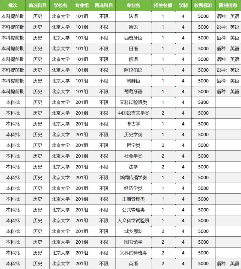 2024年北京大学在广东省历史类的本科提前批和本科批皆有招生,其中本科提前批招生专业有法语、德语、西班牙语、日语、俄语、阿拉伯语等小语种专业,要求考生考试科目为英语;本科批招生专业有考古学、中国语言文学类、历史学类、哲学类、英语等,学制均为4年,学费均为5000元/年。