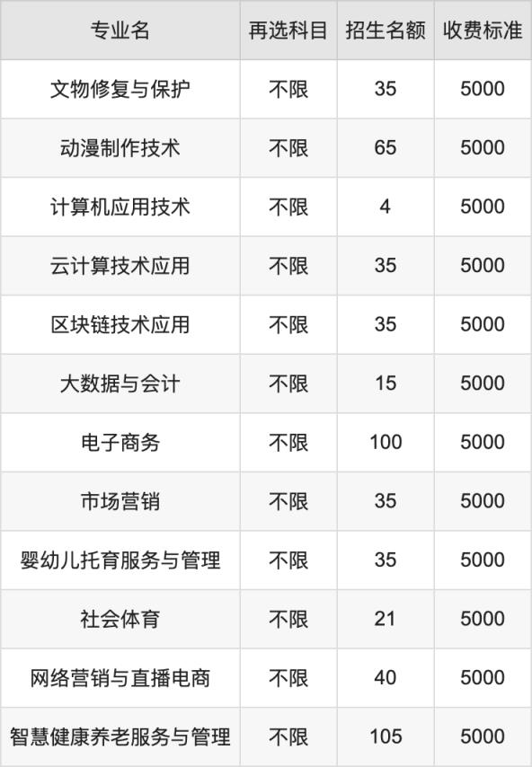 江西陶瓷工艺美术职业技术学院在历史组高职专科招生的各个专业,每年的学费是5000元。招生人数最多的专业是智慧健康养老服务与管理,2024年招105人,学费是5000元。
