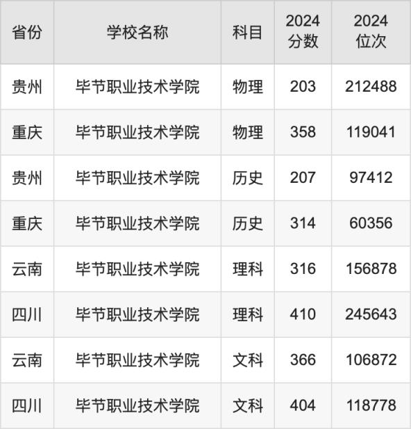 2024毕节职业技术学院录取分数线汇总:全国各省最低多少分能上